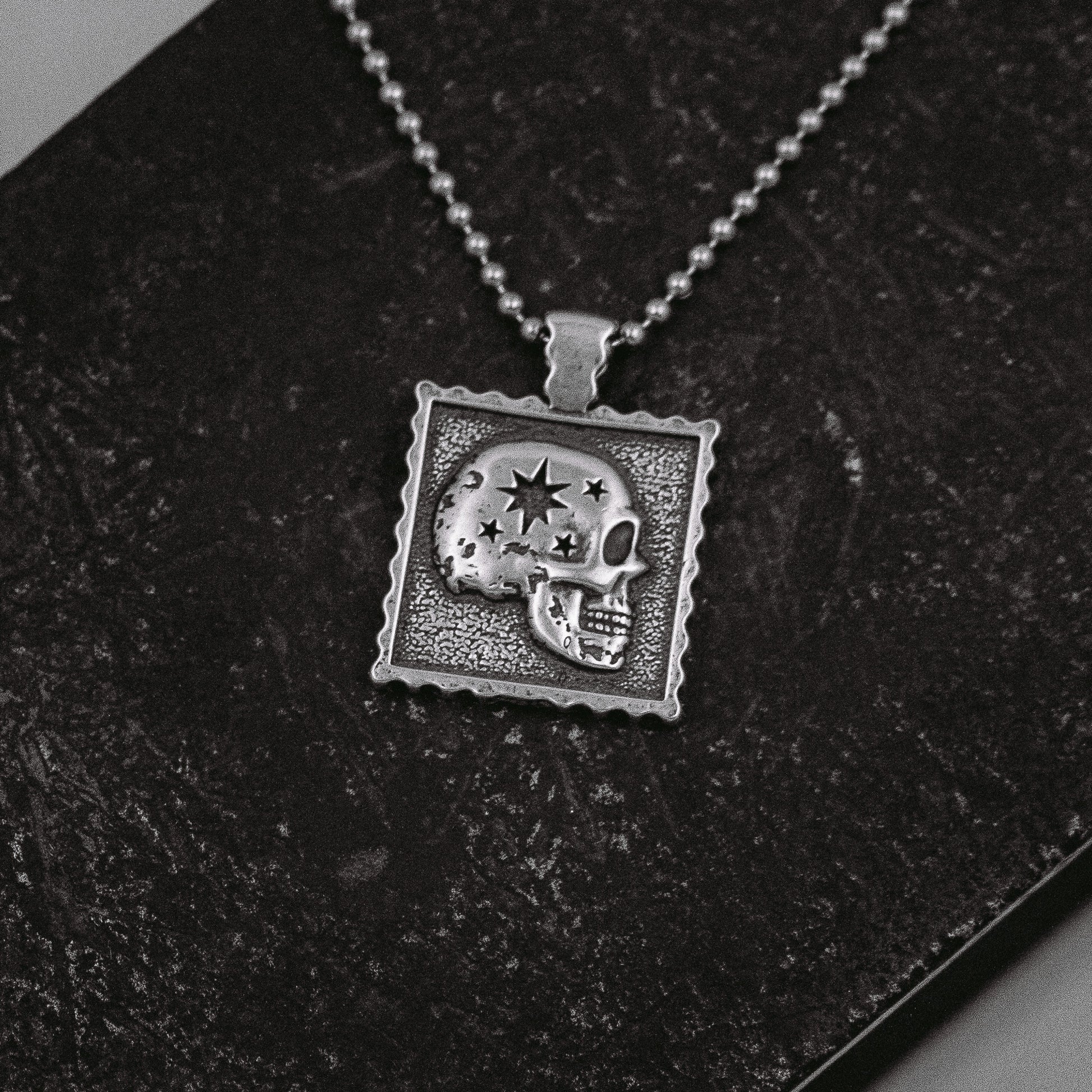This postage stamp inspired pendant features a detailed, gritty skull design with an indented star on one side.